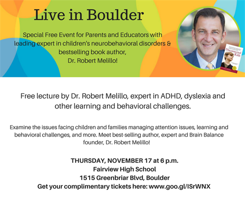 Hosted by Brain Balance of Superior, a free lecture for parents, healthcare providers and educators by Dr. Robert Melillo, expert in ADHD, dyslexia and other learning challenges.