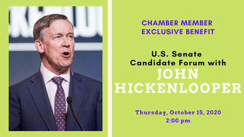 Join us for member-exclusive events. The Northwest Chamber Alliance will hold one-hour candidate forums with both candidates for U.S. Senate from Colorado – incumbent Senator Cory Gardner and former governor John Hickenlooper.  Topics will cover issues of importance to our region's business owners and professionals concerned with economic vitality.