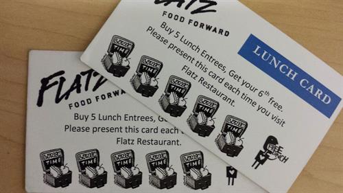 Are you looking for a new American Contemporary Restaurant to have your lunch breaks, meetings, or gatherings?Join us EVERY DAY from 11:00am - 2:00pm in our Restaurant for Lunch!! We offer many different food selections and are highly known for Flatz Food Forward. We feature our Lunch Punch Cards too! EVERY entree purchased gets you closer to one on the house!