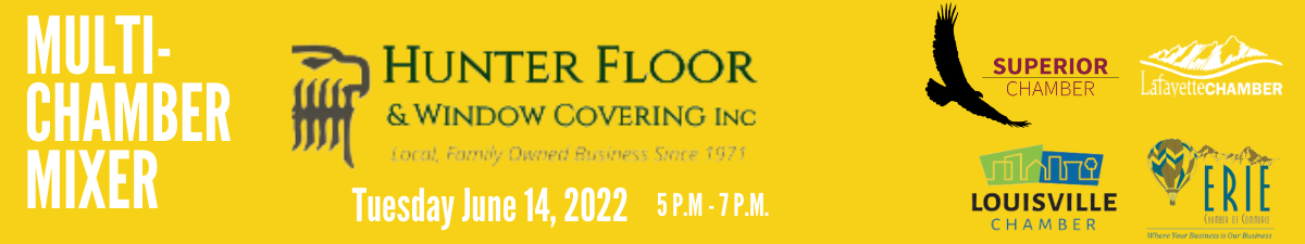 Hunter Floor & Window Covering invites members to join us in welcoming in summer and meeting with our friends from the Superior, Louisville, Lafayette, and Erie chambers. Enjoy cold beverages, Lu Lu’s BBQ, and Eats & Sweets Ice Cream for a true warm weather kick off.