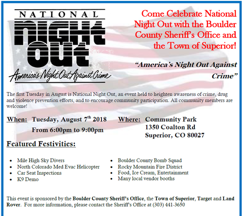 National Night Out is sponsored by Boulder County Sheriff's Office, the Town of Superior, Target, and Land Rover. It is an event held nationally to heighten awareness of crime, drug and violence prevention, and to encourage community participation. All community members are welcome at this FREE event. Featured festivities include: