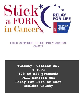On Tuesday, October 25, the Old Chicago in Superior, CO will be participating in the Stick A Fork In Cancer campaign with the American Cancer Society. 10% of all proceeds throughout the day will be donated to the Relay For Life of East Boulder County. Make sure to stop by with your office, friends and family to give back to a great cause!
