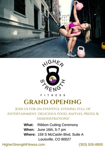Together with the Louisville Chamber, we are honored to help celebrate a new business owner! Join us for the official ribbon cutting for Higher Strength on Thursday, June 16th at 5pm. Following the ceremony, owners Barney and Kathrine will host an Open House so everyone can see their new fitness facility.