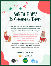 Free digital photo with your pet and Santa! Bring a toy for the EFAA Toy Drive and receive 1 free entry to our deluxe gift basket drawing!