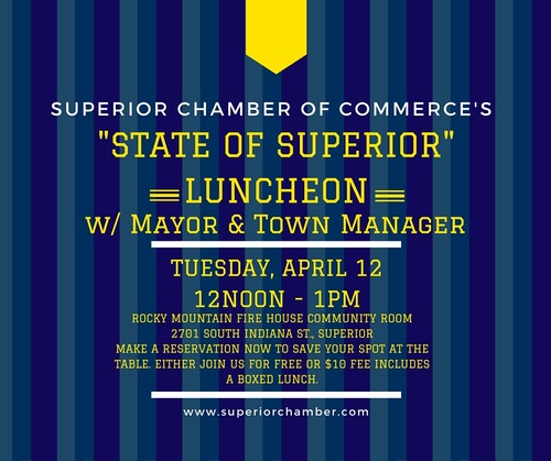 Join us for a lunch meeting on April 12 to hear the "State of Superior". We will be joined by both Mayor Clint Folsom, as well as Town Manager, Matt Magley. They will share updates and insights into what is happening in our town. Make a reservation now to save your spot at the table. Either join us for FREE or $10 fee includes a boxed lunch.