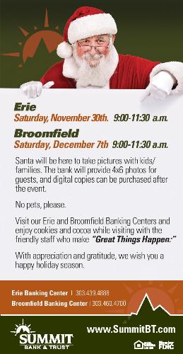 Join us Sat, Dec. 7th at our Summit Bank & Trust Broomfield location (on Coalton Rd) between 9:00-11:30am for FREE photos with Santa! We'll deck the halls and have the Big Guy here for family photos, along with cookies and hot cocoa. Come ring in the holiday season at our idyllic location and get your holiday photos out of the way early!